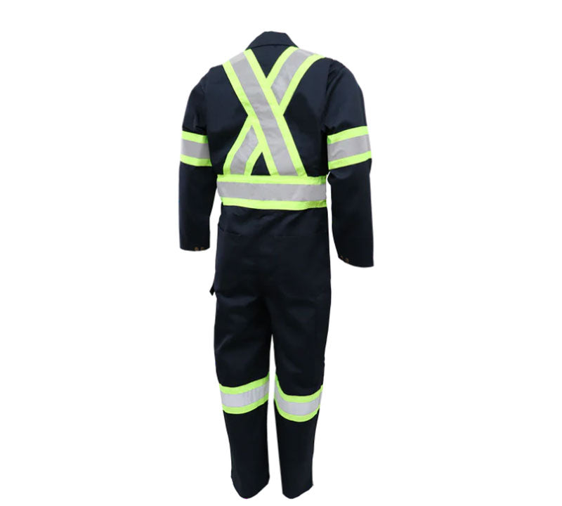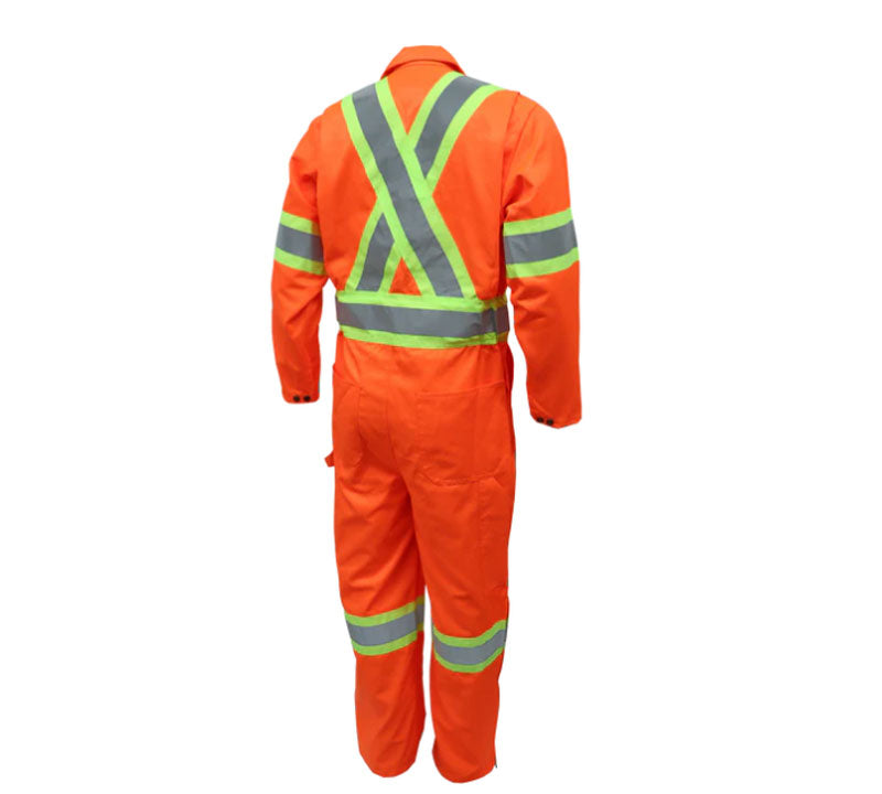 - Reflective silver 2" wide on heavy grain yellow fluorescent fabric 4" wide (at size, chest, arms, legs and an X at back).